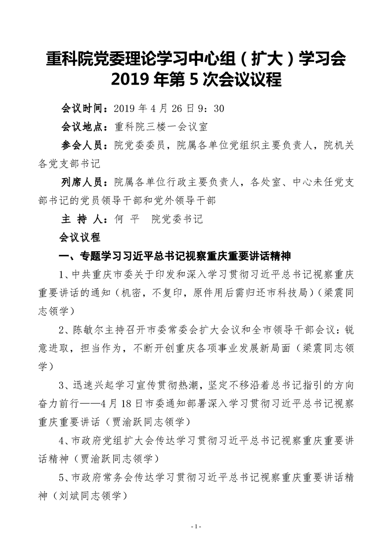 重科凯发k8国际2019年第5次理论学习中心组(扩大)学习会会议议程