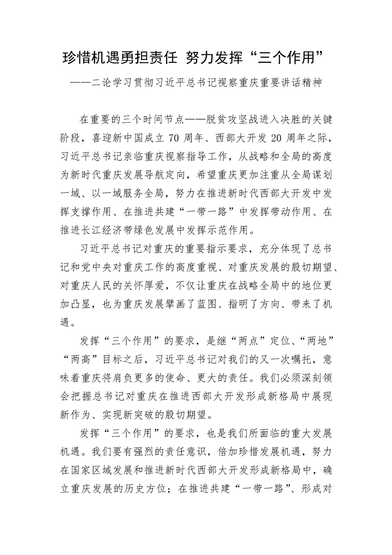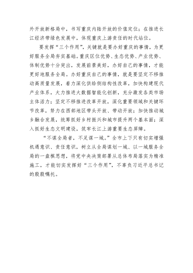 珍惜机遇勇担责任 努力发挥“三个作用”——二论学习贯彻习近平总书记视察重庆重要讲话精神